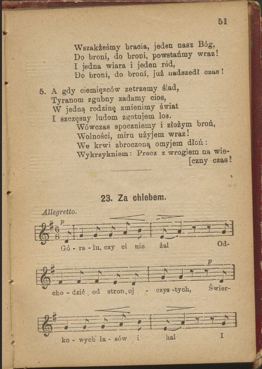 V Poľsku bola melódia prvýkrát zaznamenaná v roku 1896 v druhej časti spevníka Nasze hasło, vydaného v Tarnove pre poľskú mládež, tentokrát pod názvom Za chlebem a bez udania autorov.